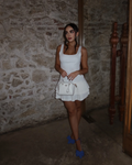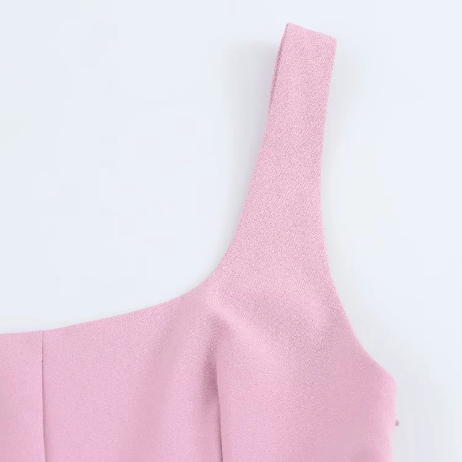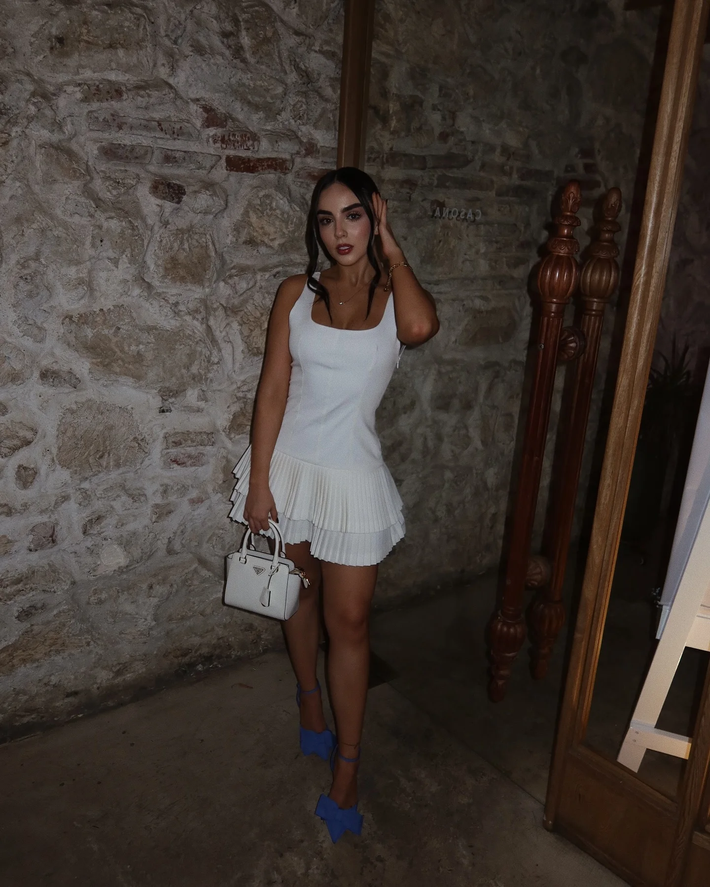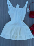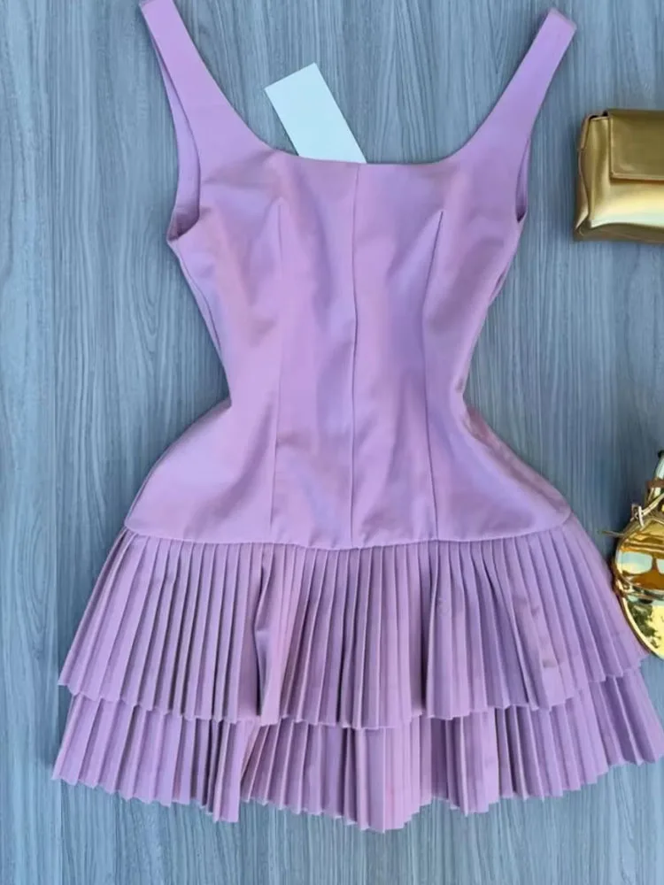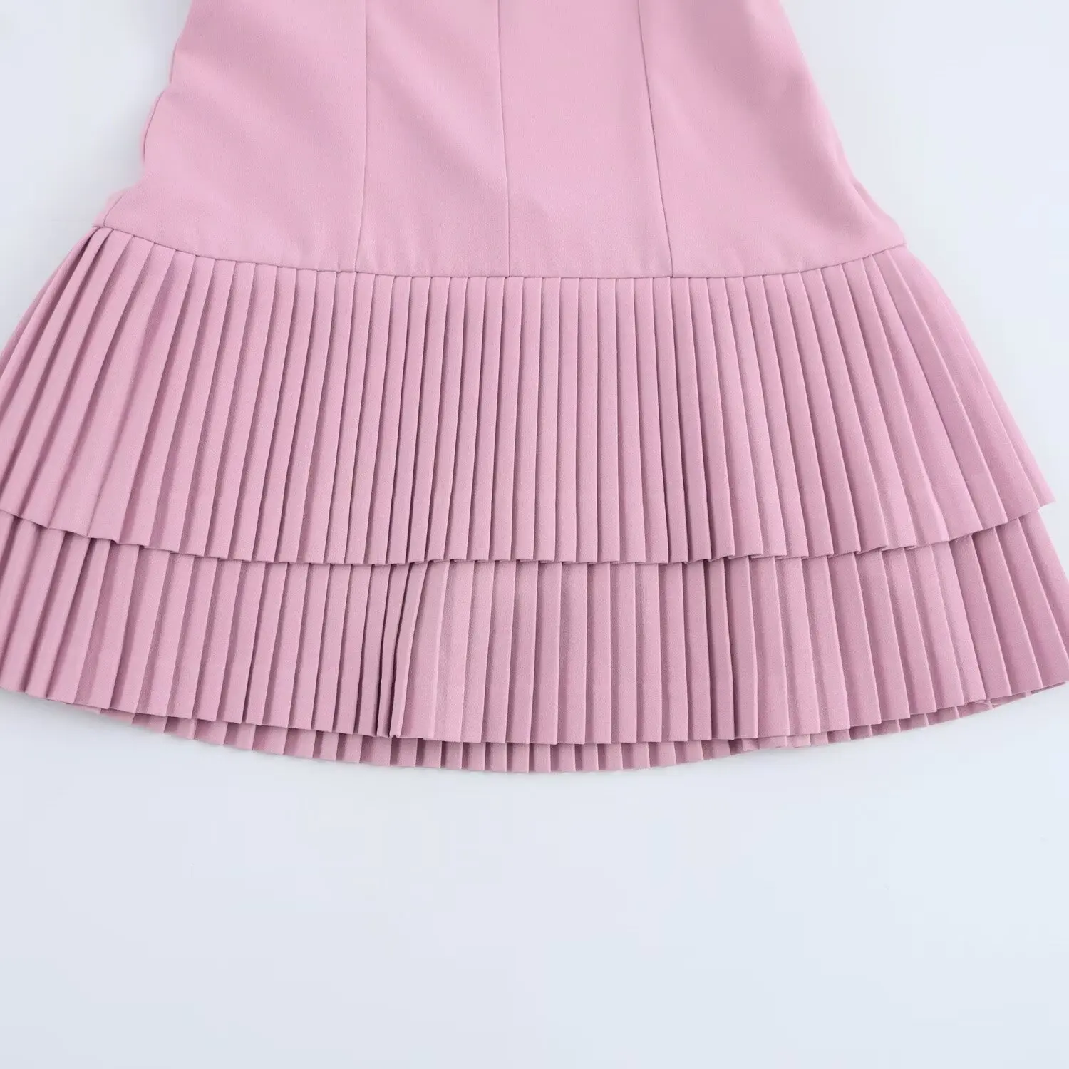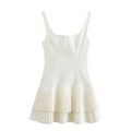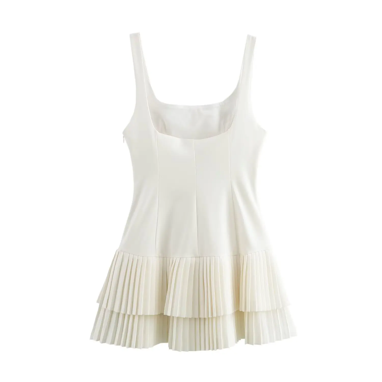 Elegant and easy to wear. Fitted bodice that defines the waist, two-layer pleated skirt with great movement, and an invisible side zipper for effortless dressing.